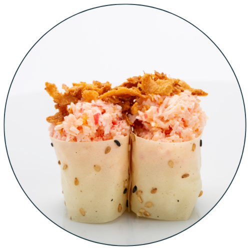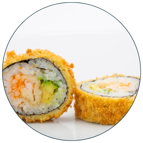 Rollos grandes de arroz envueltos con alga nori, fritos rellenos de langostinos, aguacate y tobiko